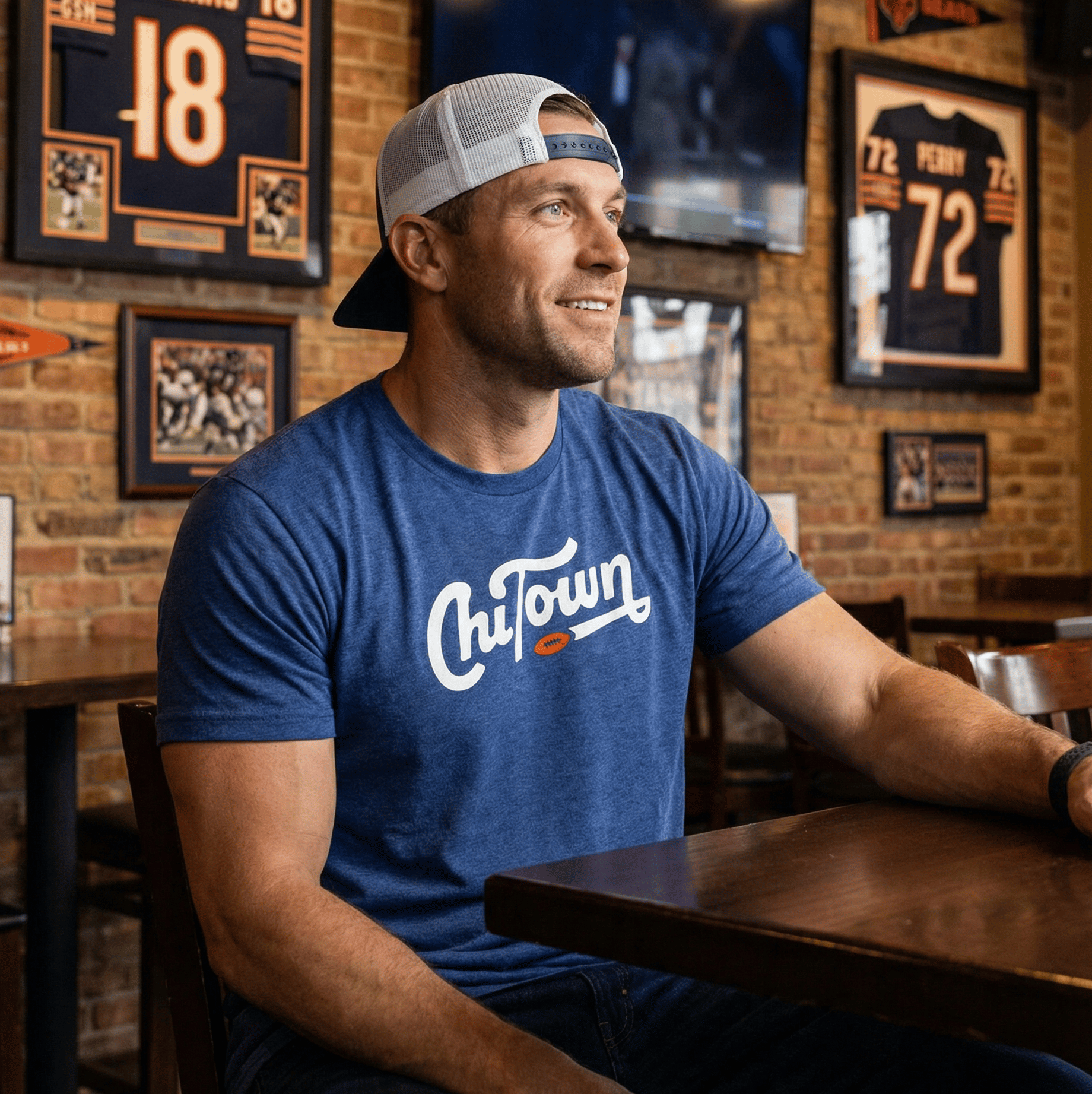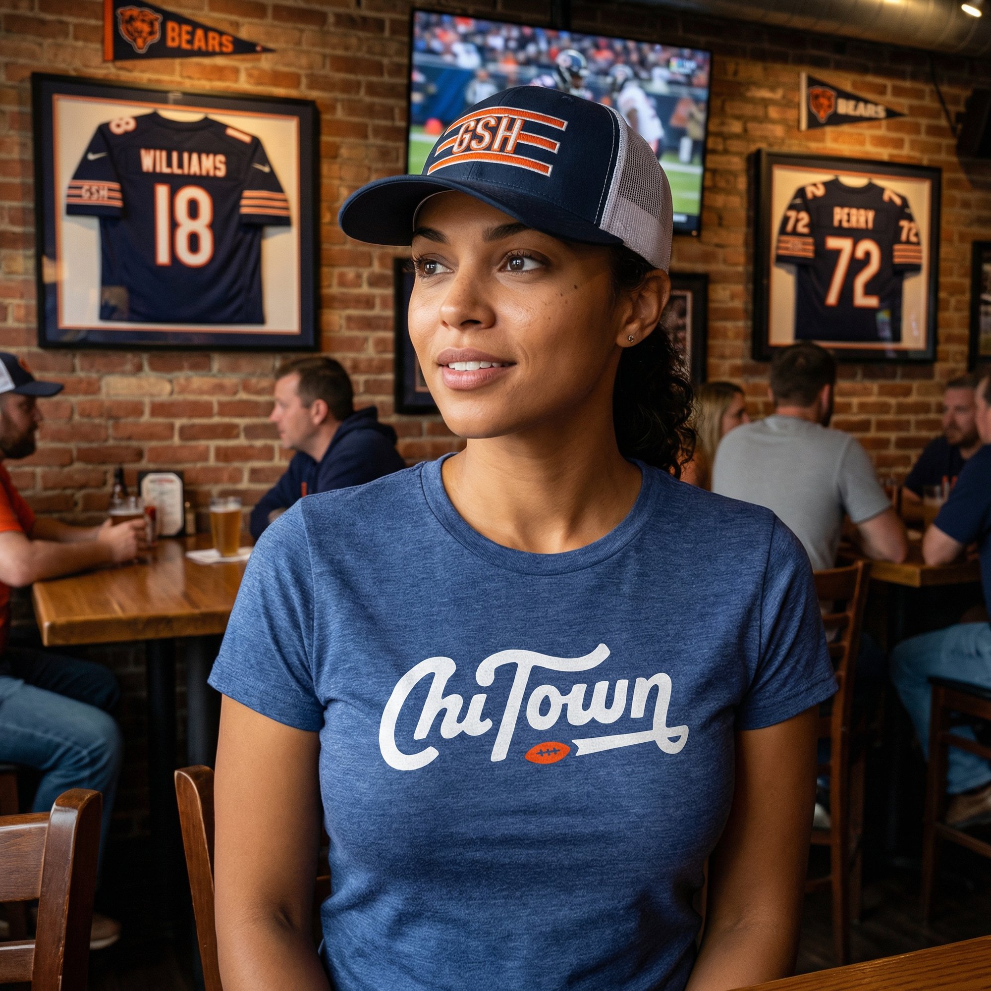 Created in collaboration with Illinois native and lifelong Bears fan Jud Lively, the script nods to classic Chicago football. That crisp orange football soars in a straight line. Like it was thrown on a rope.